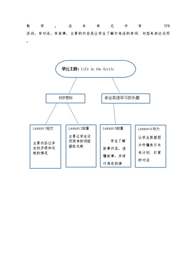 本单元以“Life in the Arctic”为主题,紧紧围绕着“北极”开展学习和探讨活动, 教材中的四个语篇形式各不相同, 但内容相互关联, 紧扣单元主题, 构成了二个主题意义“学会描绘北极的单词及句型”、“学会在实际场景中学会运用句子”。 让学生相互交流个人信息。所以本单元主要是利用活动来进行,用活动来整合整个教学。在本单元中有 TPR 活动,有对话,有故事,主要的内容是让学生了解打电话的单词、句型来表达运用。