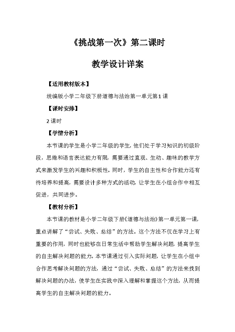 这是一份小学政治 (道德与法治)统编版(2024)二年级下册第一单元 让我试试看1 挑战第一次第二课时教案,共7页。教案主要包含了适用教材版本,课时安排,学情分析,教材分析,教学目标,教学重点,教学难点,教学准备等内容,欢迎下载使用。