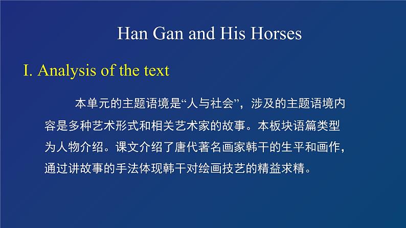 本单元的主题语境是“人与社会”,涉及的主题语境内容是多种艺术形式和相关艺术家的故事。本板块语篇类型为人物介绍。课文介绍了唐代著名画家韩干的生平和画作,通过讲故事的手法体现韩干对绘画技艺的精益求精。