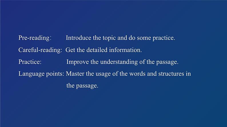 Pre-reading: Intrduce the tpic and d sme practice.Careful-reading: Get the detailed infrmatin.Practice: Imprve the understanding f the passage.Language pints: Master the usage f the wrds and structures in the passage.