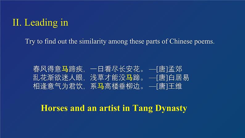 春风得意马蹄疾,一日看尽长安花。 —[唐]孟郊乱花渐欲迷人眼,浅草才能没马蹄。 —[唐]白居易相逢意气为君饮,系马高楼垂柳边。 —[唐]王维