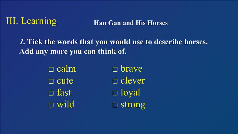 We have learned Han Gan and His Hrses, experiencing the fantastic skills f the painter and getting familiar with the basic technique f hw t intrduce a persn and his stry.