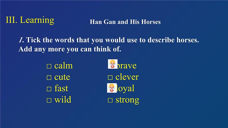 1. Tick the wrds that yu wuld use t describe hrses. Add any mre yu can think f.
