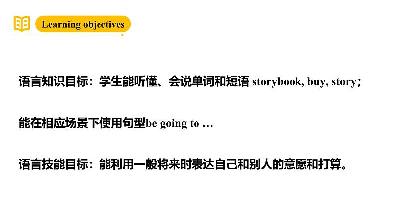 语言知识目标:学生能听懂、会说单词和短语 strybk, buy, stry;能在相应场景下使用句型be ging t …语言技能目标:能利用一般将来时表达自己和别人的意愿和打算。
