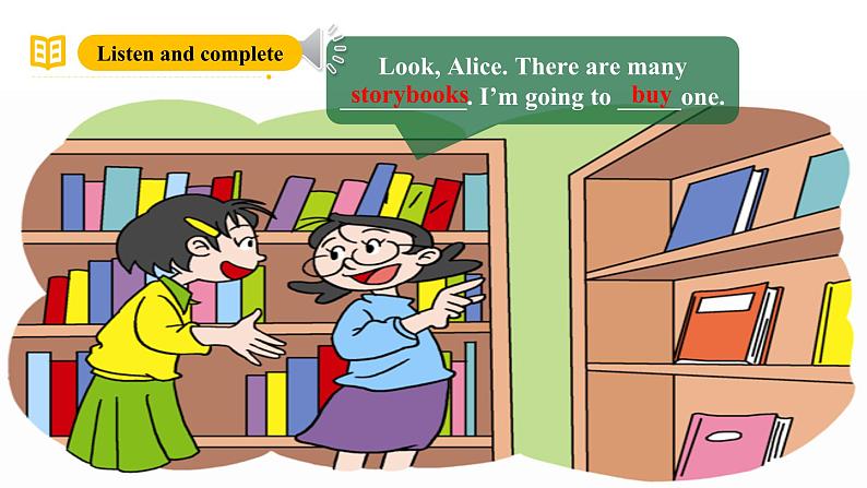 Alice and I are ging t buy sme bks. What will we buy? Let’s read and say.