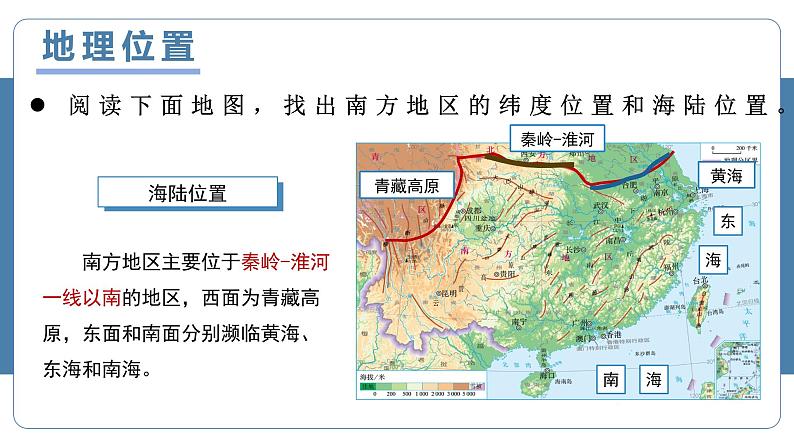 阅读下面地图,找出南方地区的纬度位置和海陆位置。