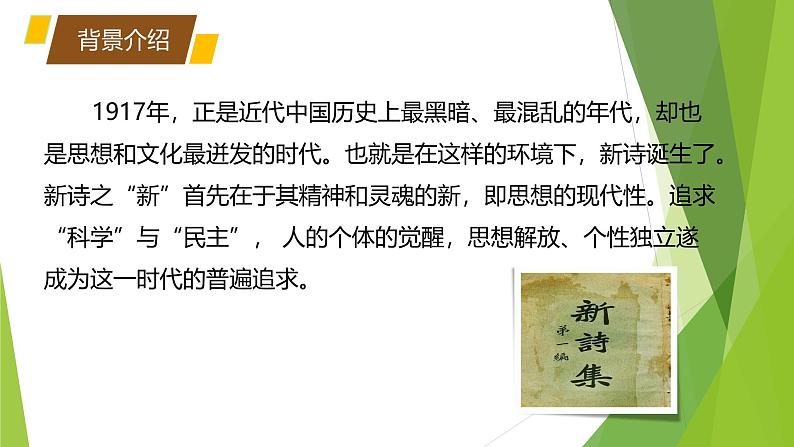 1917年,正是近代中国历史上最黑暗、最混乱的年代,却也是思想和文化最迸发的时代。也就是在这样的环境下,新诗诞生了。新诗之“新”首先在于其精神和灵魂的新,即思想的现代性。追求“科学”与“民主”, 人的个体的觉醒,思想解放、个性独立遂成为这一时代的普遍追求。