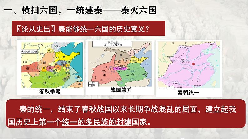 秦的统一,结束了春秋战国以来长期争战混乱的局面,建立起我国历史上第一个统一的多民族的封建国家。