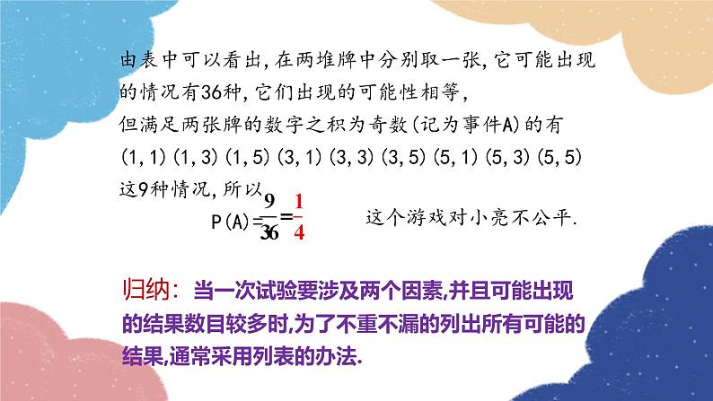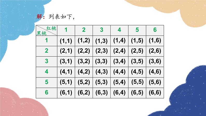 归纳:当一次试验要涉及两个因素,并且可能出现的结果数目较多时,为了不重不漏的列出所有可能的结果,通常采用列表的办法.