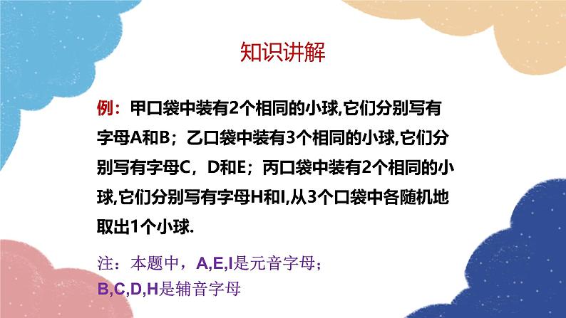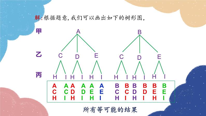 例:甲口袋中装有2个相同的小球,它们分别写有字母A和B;乙口袋中装有3个相同的小球,它们分别写有字母C,D和E;丙口袋中装有2个相同的小球,它们分别写有字母H和I,从3个口袋中各随机地取出1个小球.