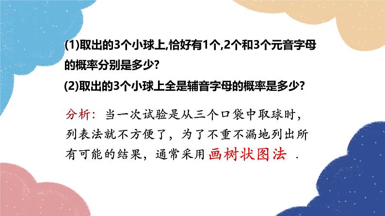 (1)只有一个元音字母的结果(红色)有___个, 即_______________________________, ∴P(1个元音)=_______. 有两个元音的结果(绿色)有___个, 即______________________________, ∴P(2个元音)=______. 全部为元音字母的结果(蓝色)有____个, 即________,∴P(3个元音)=________.(2)全是辅音字母的结果(紫色)共有____个, 即_____________,∴P(3个辅音)=_____.