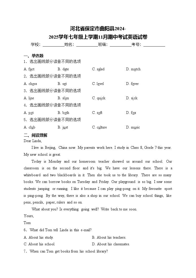 这是一份河北省保定市曲阳县2024-2025学年七年级上学期11月期中考试英语试卷(含答案),共15页。试卷主要包含了单选题,阅读理解,补全对话,情景问答,完形填空,短文填空题,写作题等内容,欢迎下载使用。