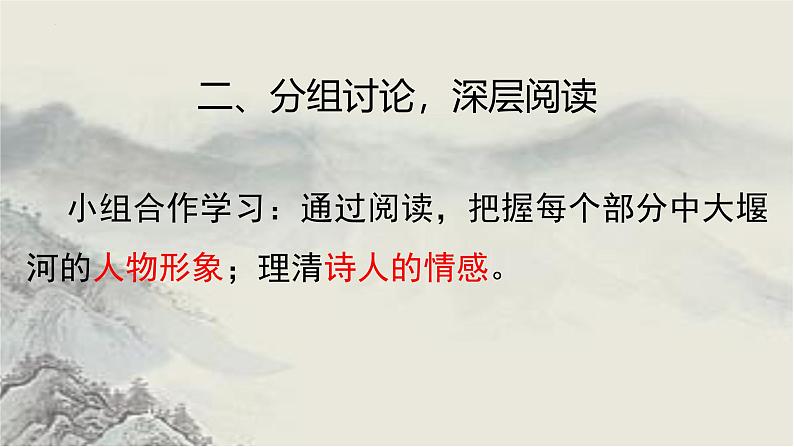 小组合作学习:通过阅读,把握每个部分中大堰河的人物形象;理清诗人的情感。
