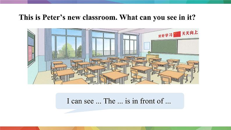 1. There are 41 desks in Peter’s classrm.2. Peter sits at the back f the classrm.3. There are tw blackbards in the classrm.4. Students put imprtant ntices n the smart whitebard.