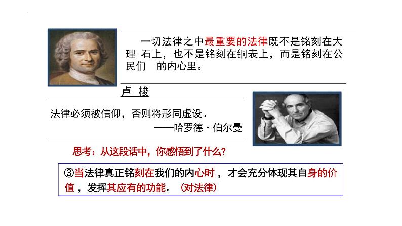 一切法律之中最重要的法律既不是铭刻在大理 石上,也不是铭刻在铜表上,而是铭刻在公民们 的内心里。卢 梭
