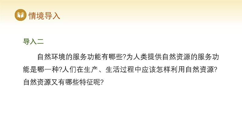 这是一份地理选择性必修3 资源、环境与国家安全第二节 自然资源及其利用优质课课件ppt,共35页。PPT课件主要包含了自然资源及其利用,课标要求,学习目标,自然资源及其属性,自然资源的主要类型,自然资源的数量特征,自然资源的质量特征,随堂练习等内容,欢迎下载使用。