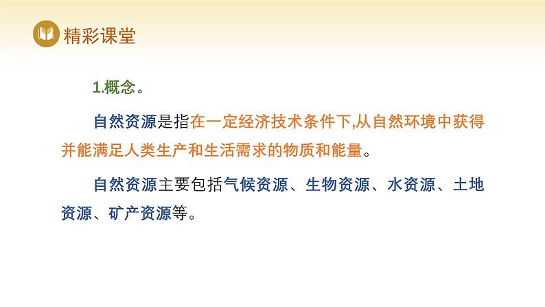 1.概念。自然资源是指在一定经济技术条件下,从自然环境中获得并能满足人类生产和生活需求的物质和能量。自然资源主要包括气候资源、生物资源、水资源、土地资源、矿产资源等。