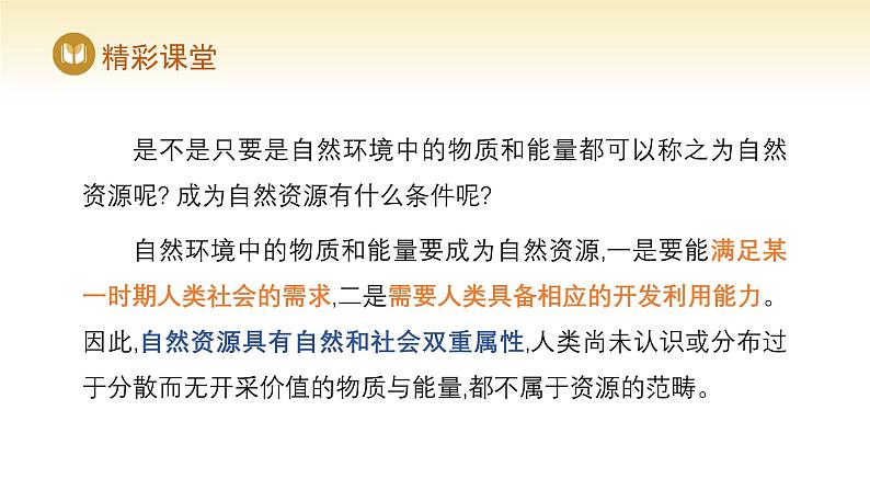 是不是只要是自然环境中的物质和能量都可以称之为自然资源呢? 成为自然资源有什么条件呢?自然环境中的物质和能量要成为自然资源,一是要能满足某一时期人类社会的需求,二是需要人类具备相应的开发利用能力。因此,自然资源具有自然和社会双重属性,人类尚未认识或分布过于分散而无开采价值的物质与能量,都不属于资源的范畴。