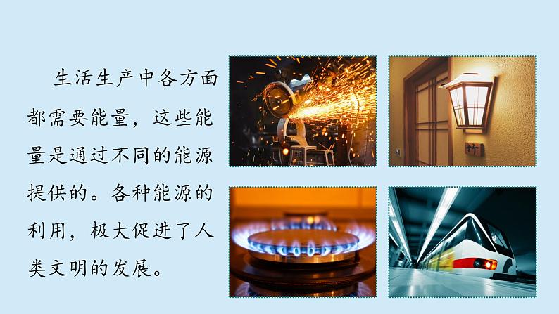 生活生产中各方面都需要能量,这些能量是通过不同的能源提供的。各种能源的利用,极大促进了人类文明的发展。
