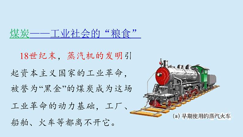 18世纪末,蒸汽机的发明引起资本主义国家的工业革命,被誉为“黑金”的煤炭成为这场工业革命的动力基础,工厂、船舶、火车等都离不开它。