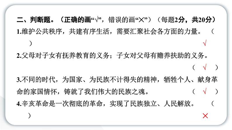这是一份人教统编版道德与法治五年级下册期末测试卷(二)(教学)习题课件,共18页。PPT课件主要包含了社会阅历,家庭成员,优秀家风,自觉约束,南京条约,香港岛,李大钊,独立自主,抗美援朝战争等内容,欢迎下载使用。
