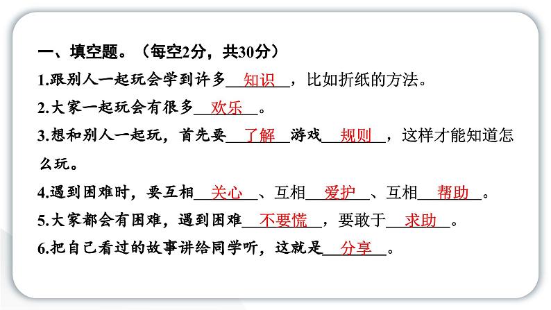 第四单元学习达标测试一、填空题。(每空2分,共30分)1.跟别人一起玩会学到许多 知识 ,比如折纸的方法。 2.大家一起玩会有很多 欢乐 。 3.想和别人一起玩,首先要 了解 游戏 规则 ,这样才能知道怎么玩。 4.遇到困难时,要互相 关心 、互相 爱护 、互相 帮助 。 5.大家都会有困难,遇到困难 不要慌 ,要敢于 求助 。 6.把自己看过的故事讲给同学听,这就是 分享 。 知识 欢乐 了解 规则 关心 爱护 帮助 不要慌 求助 分享 7. 书 是知识的宝库,我们每天上课和书打交道,学到了 许许多多 的知识。 8.我们可以和同学 合作 做一幅美丽的剪贴画。 9.有人帮,不 一样 。 10.温暖的“接力棒”是说 温暖 应该传递。 书 许许多多 合作 一样 温暖 二、选择题。(把正确答案的序号填在括号里)(每题2分,共20分)1.两个小朋友一起下棋,玩不下去的原因不可能是( B )。B2.丽丽将羽毛球打到房顶上了,她应该( C )。3.早上醒来,找不到衣服,我们应该( B )。CB4.学习中大家都会遇到困难,这个时候我们要( A )。5.同桌让你一起合作考试,共同做试卷,你会( A )。AA6.下列情况中不属于分享的是( B )。7.眼睛进了沙子后,应该( B )。BB8.下列做法中错误的是( C )。9.有了新玩具,你会( B )。CB10.分享是一件好事,但是不能( C )。C三、判断题。(正确的画“√”,错误的画“✕”)(每题2分,共20分)1.同学们要打乒乓球,小华坐在球台上不下来。 ( ✕ )2.高年级的同学可以抢低年级同学的足球。 ( ✕ )3.约好朋友一起钓鱼,很有趣。 ( √ )4.小明遇到困难时总爱向别人求助,他自己却不爱帮助别人。 ( ✕ )5.当我们遇到困难向别人求助时,一定要有礼貌。 ( √ )✕✕√✕√7.难过的事情不能跟别人分享,以免影响别人的心情。 ( ✕ )8.有的困难我们自己可以解决,有的困难需要他人的帮助。 ( √ )9.成为少先队员后,我们要学会自己系红领巾。 ( √ )10.得到警察叔叔的帮助后,我们可以向警察叔叔行队礼表示感谢。 ( √ )✕√√√6.下雨天同学没带伞,我们应该主动帮他打伞。 ( √ )√四、连线题。(12分)分享食物一起合作一起玩耍互帮互助五、简答题。(每题6分,共18分)1.举例说说你是怎样解决与小伙伴之间的“小疙瘩”的。尊重别人,不发脾气,和气协商,礼貌谦让。(答案不唯一)2.你愿意把自己的好东西和别人分享吗?为什么?我愿意。因为好东西和大家共同分享更能体现出它的价值,如果每个人都乐意和别人共同分享,就能形成互助互爱的良好局面。(答案不唯一)3.请说说你参加过哪些少先队的活动。为希望工程献爱心、参观革命纪念地、清明节扫墓等。(答案不唯一)