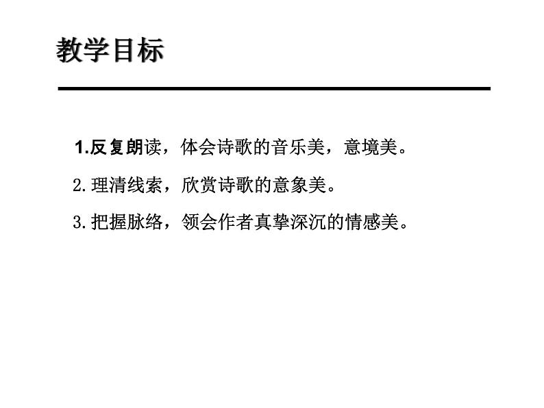 1.反复朗读,体会诗歌的音乐美,意境美。 2.理清线索,欣赏诗歌的意象美。 3.把握脉络,领会作者真挚深沉的情感美。