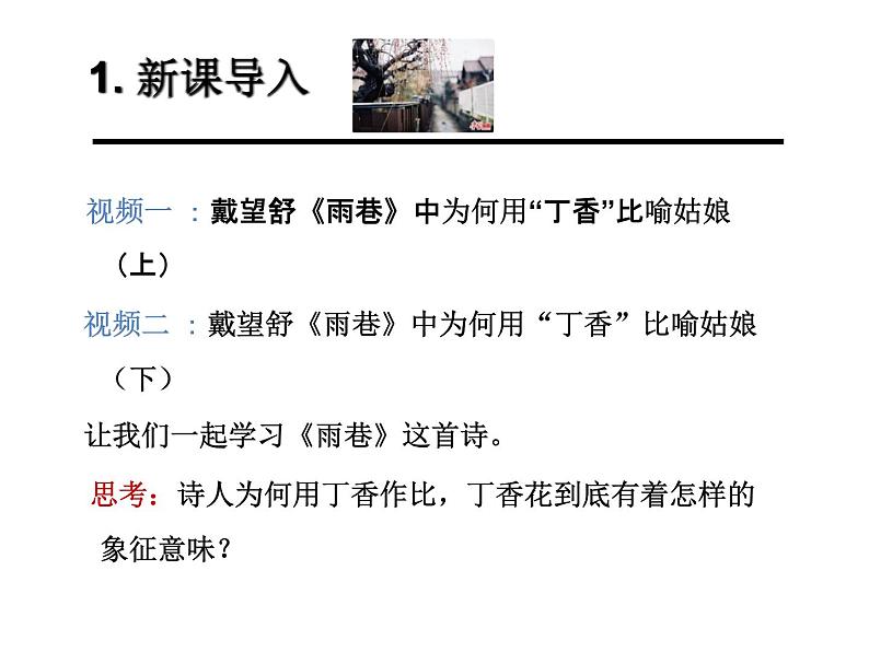 视频一 :戴望舒《雨巷》中为何用“丁香”比喻姑娘(上) 视频二 :戴望舒《雨巷》中为何用“丁香”比喻姑娘(下) 让我们一起学习《雨巷》这首诗。 思考:诗人为何用丁香作比,丁香花到底有着怎样的象征意味?