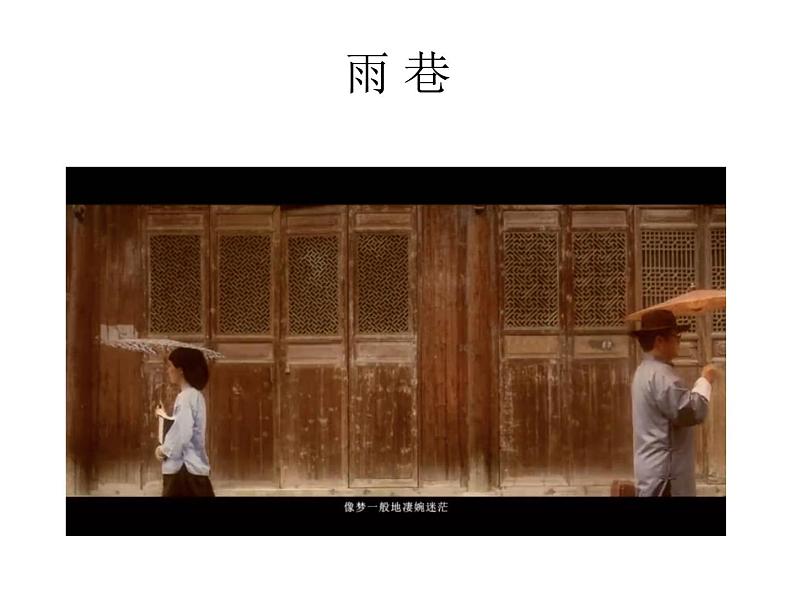 《雨巷》用丁香比作美女受传统诗词和民俗文化的影响,但这种愁怨是淡淡的健康的。冯宗璞《丁香结》:结,是解不完的;人生中的问题也是解不完的。 诗的音节很美、意境也很美,四元素(意象):小雨、巷子、油纸伞、丁香花,人物:我和丁香姑娘,我是实写,丁香姑娘是虚写;我希望逢着像丁香一样的姑娘,逢着了吗?美好的意境。