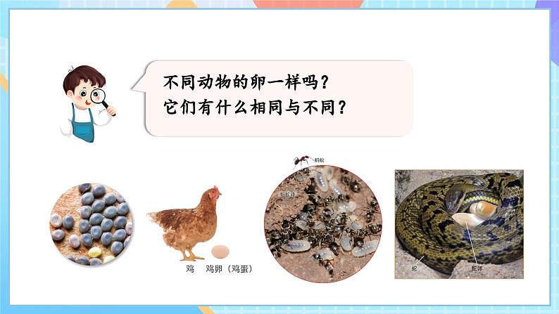 观察材料:鸡和鸡卵(鸡蛋)、鱼和鱼卵、蛙和蛙卵、龟和龟卵、蚂蚁和蚂蚁卵5种动物及其卵的图片。