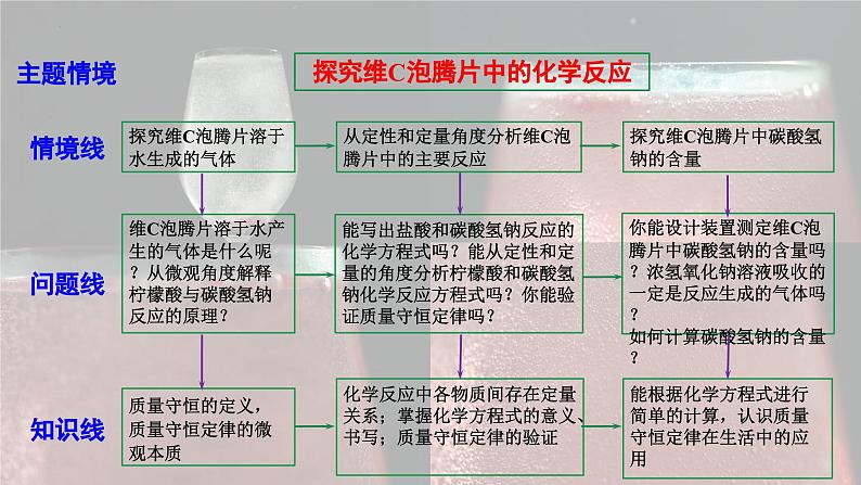 1.通过“探究维C泡腾片溶于水生成的气体”的探究活动,知道化学反应遵循质量守恒定律,理解质量守恒定律的微观本质2.通过“从定性和定量角度分析维C泡腾片中的主要反应”,认识化学反应中各物质间存在定量关系,掌握化学方程式的意义、书写以及质量守恒定律的验证3.通过“探究维C泡腾片中碳酸氢钠的含量”的探究活动,掌握化学方程式的简单计算,认识质量守恒定律在生活中的应用