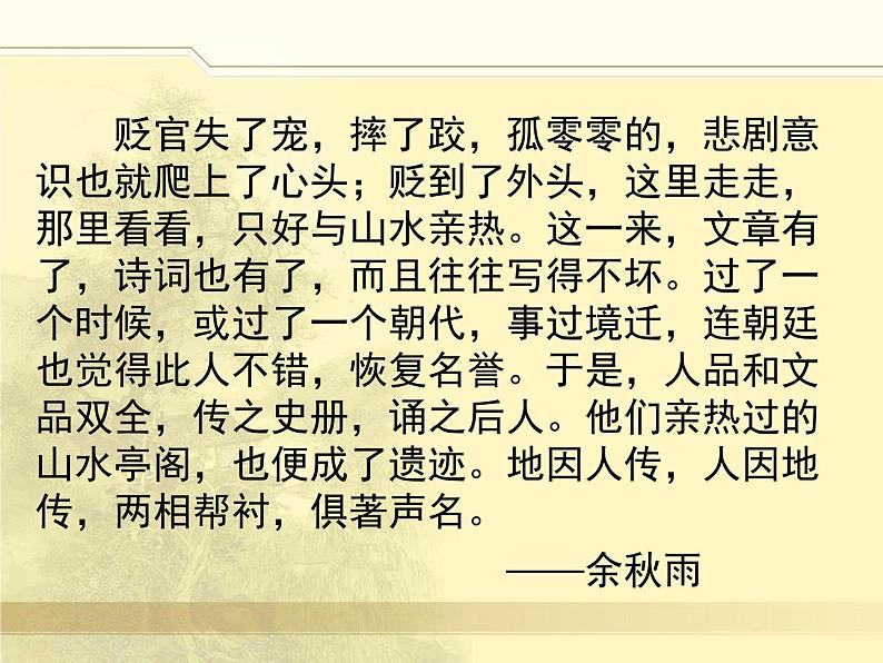 贬官失了宠,摔了跤,孤零零的,悲剧意识也就爬上了心头;贬到了外头,这里走走,那里看看,只好与山水亲热。这一来,文章有了,诗词也有了,而且往往写得不坏。过了一个时候,或过了一个朝代,事过境迁,连朝廷也觉得此人不错,恢复名誉。于是,人品和文品双全,传之史册,诵之后人。他们亲热过的山水亭阁,也便成了遗迹。地因人传,人因地传,两相帮衬,俱著声名。 ——余秋雨