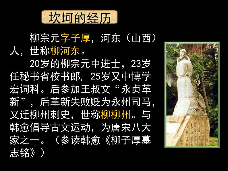 20岁的柳宗元中进士,23岁任秘书省校书郎, 25岁又中博学宏词科。后参加王叔文“永贞革新”,后革新失败贬为永州司马,又迁柳州刺史,世称柳柳州。与韩愈倡导古文运动,为唐宋八大家之一。(参读韩愈《柳子厚墓志铭》)