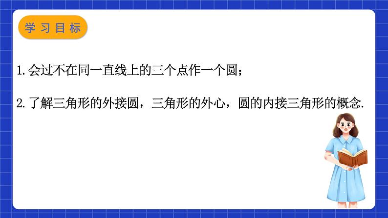1.会过不在同一直线上的三个点作一个圆;2.了解三角形的外接圆,三角形的外心,圆的内接三角形的概念.