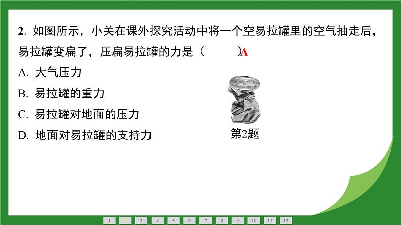 2. 如图所示,小关在课外探究活动中将一个空易拉罐里的空气抽走后,易拉罐变扁了,压扁易拉罐的力是( A )