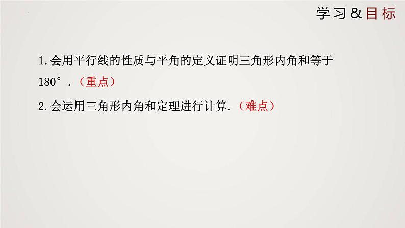 1.会用平行线的性质与平角的定义证明三角形内角和等于180°.(重点)