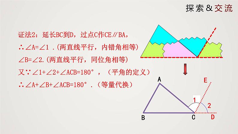 证法2:延长BC到D,过点C作CE∥BA,∴∠A=∠1 .(两直线平行,内错角相等)∠B=∠2.(两直线平行,同位角相等)又∵∠1+∠2+∠ACB=180°,(平角的定义)∴∠A+∠B+∠ACB=180°.(等量代换)