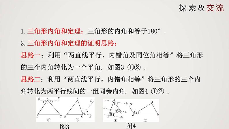 1.三角形内角和定理:三角形的内角和等于180°.2.三角形内角和定理的证明思路:思路一:利用“两直线平行,内错角及同位角相等”将三角形的三个内角转化为一个平角. 如图3 ①② . 思路二:利用“两直线平行,内错角相等”将三角形的三个内角转化为两平行线间的一组同旁内角. 如图4 ①② .