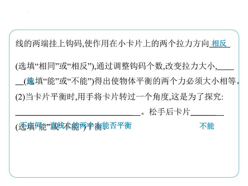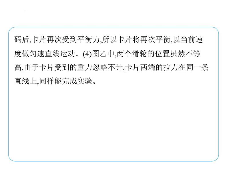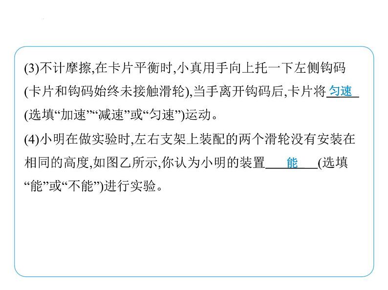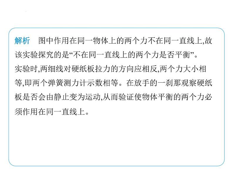 重点实验综合全练(三)力学探究实验(二)相等相反作用在同一直线上解析 图中作用在同一物体上的两个力不在同一直线上,故该实验探究的是“不在同一直线上的两个力是否平衡”。实验时,两细线对硬纸板拉力的方向应相反,两个力大小相等,即两个弹簧测力计示数相等。在放手的一刹那观察硬纸板是否会由静止变为运动,从而验证使物体平衡的两个力必须作用在同一直线上。线的两端挂上钩码,使作用在小卡片上的两个拉力方向 (选填“相同”或“相反”),通过调整钩码个数,改变拉力大小, (选填“能”或“不能”)得出使物体平衡的两个力必须大小相等。(2)当卡片平衡时,用手将卡片转过一个角度,这是为了探究: 。松手后卡片 (选填“能”或“不能”)平衡。相反能不在同一直线上的两个力能否平衡不能(3)不计摩擦,在卡片平衡时,小真用手向上托一下左侧钩码(卡片和钩码始终未接触滑轮),当手离开钩码后,卡片将 (选填“加速”“减速”或“匀速”)运动。(4)小明在做实验时,左右支架上装配的两个滑轮没有安装在相同的高度,如图乙所示,你认为小明的装置 (选填“能”或“不能”)进行实验。匀速能解析 (1)在卡片两端的线上挂钩码,作用在卡片上的两个力方向相反;将线两端挂上相同数量的钩码,卡片能够平衡,线两端挂上不同数量的钩码,卡片不能平衡,由此能得出使物体平衡的两个力必须大小相等。(2)将卡片转过一个角度,卡片两端的拉力就不在同一条直线上了,松手后卡片会转动,即卡片不能平衡,这是验证不在同一直线上的两个力能否平衡。(3)在卡片平衡时,用手向上托一下左侧钩码,卡片将不再平衡,卡片右侧拉力较大,所以卡片将会向右运动;当手离开钩码后,卡片再次受到平衡力,所以卡片将再次平衡,以当前速度做匀速直线运动。(4)图乙中,两个滑轮的位置虽然不等高,由于卡片受到的重力忽略不计,卡片两端的拉力在同一条直线上,同样能完成实验。3.(2024江苏无锡梁溪月考)物理兴趣小组的同学们利用如图所示的装置进行“二力平衡条件”的探究:(1)小组将质量相同的砝码放在左右两盘后,把小车转过一个角度,然后松手,观察到小车转动回原状后恢复到静止状态,说明两个力必须作用在 才能平衡。(2)某次实验中,当左盘砝码质量大于右盘时,小车两边的拉力大小 (选填“相等”或“不相等”),但小车仍处于静止状态。此时小车受到的 (选填“是”或“不是”)平衡力,产生这一现象的原因可能是小车受到 的影响。同一直线上不相等是摩擦力(3)为尽量减少以上影响,小敏提出将甲装置中的小车换成卡片,如图乙所示。为了验证只有作用在同一物体上的两个力才能平衡,小敏下一步操作是 。A.左右各加一个砝码B.把卡片剪成两半C.把卡片扭转一个角度(4)如果将小车换成轻质弹簧测力计,如图丙所示,在左右两盘各放入重4 N的砝码,忽略盘重和绳重,则弹簧测力计的示数为 N。B4解析 (1)把小车转过一个角度,然后松手,观察到小车转动回原状后恢复到静止状态,说明小车在水平方向上受到的两个力在同一直线上时才能平衡。(2)实验中,当左盘砝码质量大于右盘时,小车两边的拉力大小不相等;小车仍处于静止状态,此时小车还受平衡力的作用,小车有向左运动的趋势,桌面对小车有向右的摩擦力,即小车受到摩擦力的影响。(3)为了验证只有作用在同一物体上的两个力才能平衡,用剪刀把卡片剪成两半,观察两个小卡片是否平衡。(4)将小车换成轻质弹簧测力计,在左右两盘各放入重4 N的砝码,则弹簧测力计受到的两个拉力均为4 N,弹簧测力计的示数为4 N。类型二 探究阻力对物体运动的影响4.(2024河北邢台期末改编)在探究“阻力对物体运动的影响”实验中,下列说法错误的是 ( )A.实验中每次让同一小车从斜面顶端由静止滑下的目的是使小车到达水平面的速度大小相等B.实验中改变木板表面的粗糙程度是为了改变运动的小车所受的阻力大小C.根据实验现象进―步推理:如果小车运动时不受阻力,它将做匀速直线运动D.木板表面越粗糙,小车的速度减小得越慢D解析 木板表面越粗糙,阻力越大,小车运动的距离就越近,说明小车受到的阻力越大,速度减小得越快,故D错误。 5.【新课标·科学推理】(2024江苏兴化期中)关于“阻力对物体运动的影响”问题,某学习小组进行了如下探究实验:依次将毛巾、棉布分别铺在水平木板上,让小车分别从斜面顶端由静止自由下滑,观察小车在毛巾、棉布、木板三种材质的水平面上滑行的最大距离,如图所示。(1)实验中每次均让小车从斜面顶端由静止自由下滑,目的是 ,本实验中的“阻力”是指小车受到的 。(2)分析图中所示运动情况可知:小车在毛巾表面上滑行的距离最短,说明小车受到的阻力越大,速度减小得越 (选填“快”或“慢”)。(3)牛顿第一定律 (选填“是”或“不是”)直接由实验得出的,其符合逻辑的科学推理为科学研究提供了一个重要方法。使小车到达斜面底端的速度相同摩擦力快不是(4)在此实验基础上通过推理可知观点 (选填“A”或“B”)是正确的。A.物体的运动不需要力来维持B.力是维持物体运动的原因(5)在体现阻力对物体运动影响大小的方法上,小明提出了另外一个方法:测量小车在水平面上运动的时间。你支持下面哪个观点: 。A.这个方法不可行,与阻力对物体运动影响的大小没有关系B.这个方法可行,但没有小车运动的路程便