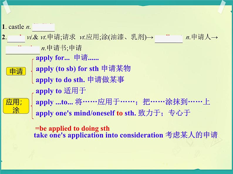 1. castle n. 堡;堡垒2. apply vi.& vt.申请;请求 vt.应用;涂(油漆、乳剂)→ applicant n.申请人→ applicatin n.申请书;申请