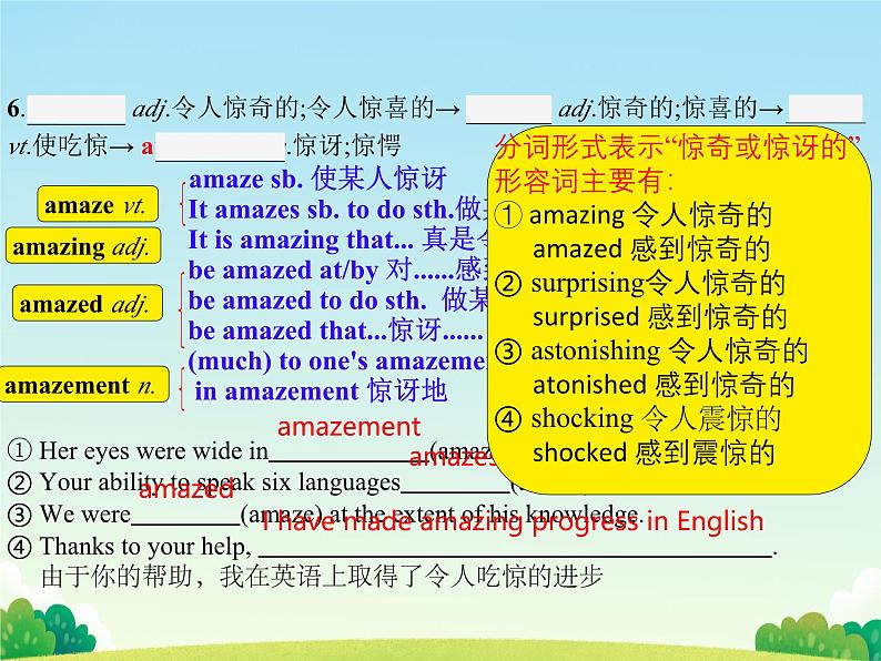 6. amazing adj.令人惊奇的;令人惊喜的→ amazed adj.惊奇的;惊喜的→ amaze vt.使吃惊→ amazement n.惊讶;惊愕① Her eyes were wide in (amaze).② Yur ability t speak six languages (amaze) me.③ We were (amaze) at the extent f his knwledge.④ Thanks t yur help, . 由于你的帮助,我在英语上取得了令人吃惊的进步