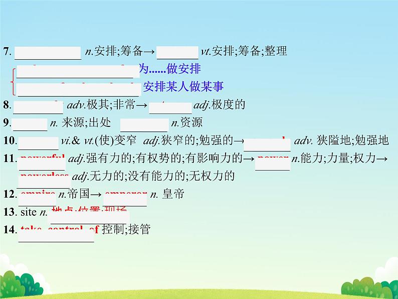7. arrangement n.安排;筹备→ arrange vt.安排;筹备;整理 make arrangements fr 为做安排 arrange fr sb. t d sth. 安排某人做某事8. extremely adv.极其;非常→ extreme adj.极度的9. surce n. 来源;出处 resurce n.资源10. narrw vi.& vt.(使)变窄 adj.狭窄的;勉强的→narrwly adv. 狭隘地;勉强地11. pwerful adj.强有力的;有权势的;有影响力的→ pwer n.能力;力量;权力→ pwerless adj.无力的;没有能力的;无权力的12. empire n.帝国→ emperr n. 皇帝13. site n. 地点;位置;现场14. take cntrl f 控制;接管