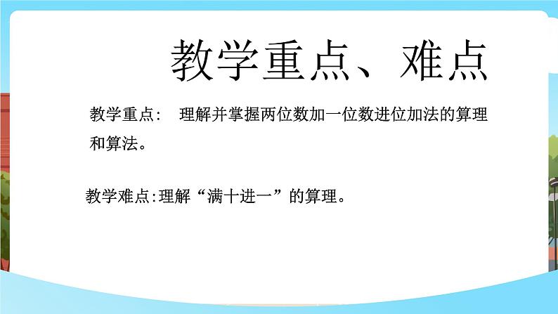 教学难点:理解“满十进一”的算理。