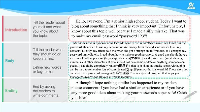 这是一份高中英语人教版 (2019)必修 第二册Unit 3 The internet一等奖ppt课件,文件包含Unit3TheInternetPeriod5ReadingforWriting精讲课件-2023-2024学年高一英语上学期同步精品课堂人教版2019必修第二册pptx、Unit3TheInternetPeriod5ReadingforWriting分层练习docx等2份课件配套教学资源,其中PPT共17页, 欢迎下载使用。