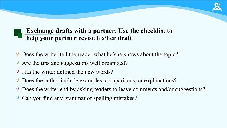 √ Des the writer tell the reader what he/she knws abut the tpic?√ Are the tips and suggestins well rganized?√ Has the writer defined the new wrds?√ Des the authr include examples, cmparisns, r explanatins?√ Des the writer end by asking readers t leave cmments and/r suggestins?√ Can yu find any grammar r spelling mistakes?