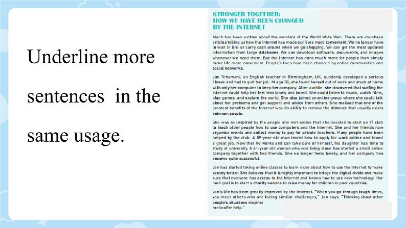 Many peple have been helped by the club.(Para 3, P28)Jan’s life has been greatly imprved by the Internet.(Para 5, P28)