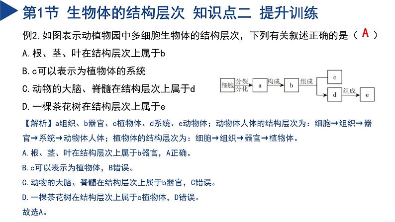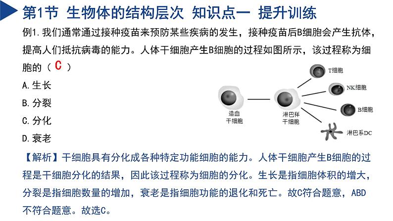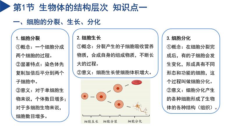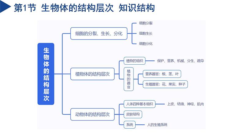 复习课件第1章 生命的结构与生殖 科学浙教版 七年级下册生物体的结构层次PART 01第1节 生物体的结构层次 知识结构第1节 生物体的结构层次 知识点一一、细胞的分裂、生长、分化1.细胞分裂 ①概念:一个细胞分成两个细胞的过程。②显著特点:染色体先复制加倍后平分到两个子细胞中。③意义:对于单细胞生物来说,个体数目增多;对于多细胞生物来说,细胞数目增多。2.细胞生长①概念:分裂产生的子细胞吸收营养物质,合成自身的组成物质,不断长大的过程。②意义:细胞生长使细胞体积增大。3.细胞分化①概念:在细胞分裂完成后,有的子细胞会发生变化,形成具有不同形态和功能的细胞,这个过程叫做细胞分化。②意义:细胞分化产生的各种细胞形成了生物体的各种结构(组织)。第1节 生物体的结构层次 知识点一 提升训练例1.我们通常通过接种疫苗来预防某些疾病的发生,接种疫苗后B细胞会产生抗体,提高人们抵抗病毒的能力。人体干细胞产生B细胞的过程如图所示,该过程称为细胞的( )A.生长B.分裂C.分化D.衰老【解析】干细胞具有分化成各种特定功能细胞的能力。人体干细胞产生B细胞的过程是干细胞分化的结果,因此该过程称为细胞的分化。生长是指细胞体积的增大,分裂是指细胞数量的增加,衰老是指细胞功能的退化和死亡。故C符合题意,ABD不符合题意。故选C。C第1节 生物体的结构层次 知识点二二、植物体的结构层次1.植物的组织①组织:细胞分化成各种不同形态和不同功能的细胞群,这些细胞群就是组织。②植物五大组织 第1节 生物体的结构层次 知识点二 提升训练例2.如图表示动植物园中多细胞生物体的结构层次,下列有关叙述正确的是( )A.根、茎、叶在结构层次上属于bB.c可以表示为植物体的系统C.动物的大脑、脊髓在结构层次上属于dD.一棵茶花树在结构层次上属于e【解析】a组织、b器官、c植物体、d系统、e动物体;动物体人体的结构层次为:细胞→组织→器官→系统→动物体人体;植物体的结构层次为:细胞→组织→器官→植物体。A.根、茎、叶在结构层次上属于b器官,A正确。B.c可以表示为植物体,B错误。C.动物的大脑、脊髓在结构层次上属于b器官,C错误。D.一棵茶花树在结构层次上属于c植物体,D错误。故选A。A第1节 生物体的结构层次 知识点三三、动物体的结构层次1.人体的四种基本组织2.皮肤:表皮、真皮、皮下组织。皮肤是人体最大的器官。3.系统①能够共同完成一种或几种生理功能的多个器官,按照一定的顺序排列在一起就构成了系统。②人的生殖系统第1节 生物体的结构层次 知识点三 提升训练例3.如图所示为人体组织的形成过程,请分析回答问题。(1)图中过程①②③表示细胞 ,过程④表示细胞 ;(2)脊髓能够传导兴奋,主要由 组织构成;(3)与番茄植株的结构层次相比,人体的结构层次中多了 。分裂分化神经系统第1节 生物体的结构层次 知识点三 提升训练【解析】(1)细胞分裂就是一个细胞分成两个细胞的过程,细胞分裂使细胞数目增多。图中过程①②③的细胞数目增多,表示细胞的分裂;过程④形成了不同的组织,表示细胞的分化。(2)神经组织主要由神经细胞构成,能够感受刺激、传导神经冲动,起调节和控制作用。脊髓属于神经系统,主要由神经组织构成。(3)植物体的结构层次为细胞→组织→器官→植物体;人体的结构层次是细胞→组织→器官→系统→人体。 因此,与番茄植株的结构层次相比,人体的结构层次中多了系统。人和动物的生殖与发育PART 02第2节 人和动物的生殖与发育 知识结构第2节 人和动物的生殖与发育 知识点一 一、人的生殖与发育1.受精与妊娠(1)受精:精子和卵细胞在输卵管中结合形成受精卵的过程。受精的场所是输卵管。(2)妊娠:受精卵沿着输卵管往下移动到子宫后,经过数次分裂逐渐形成胚胎,并附着在子宫壁上,这时女性就怀孕了,也称为妊娠。(注意:精子和卵细胞受精的场所在输卵管,而胚胎发育的场所主要在子宫。)2.胚胎的发育:子宫是胚胎发育主要场所。早期胚胎发育所需的营养来自卵细胞质中的卵黄,之后胚胎通过胎盘和脐带从母体吸取营养物质和氧气,同时排出二氧化碳和其他废物。受精卵在子宫里经过9个多月的生长发育,形成成熟的胎儿。3.分娩和养育 第2节 人和动物的生殖与发育 知识点一 4.人的一生要经历:婴幼儿期、少年期、青春期、成年期、老年期。衰老的最终结果是死亡,死亡是生命的终止。心脏、肺和大脑停止活动是生命终止的主要特征。5.青春期时间①青春期是儿童期逐渐成为中年期的过渡时期,女孩的青春期一般为11到17岁,男孩的青春期一般比女孩晚2年左右。②青春期发育的特点:性发育和性成熟是青春期的显著特点,人的生殖器官迅速发育。男性睾丸体积增大,分泌雄性激素,产生精子,出现遗精;女性卵巢质量增加,分泌雌性激素,产生成熟的卵细胞,子宫内膜脱落引起子宫出血,出现月经。第2节 人和动物的生殖与发育 知识点一 提升训练例4.如图是胎儿形成过程,对该过程描述正确的是( )A.精子和卵细胞在子宫相遇结合成受精卵B.①不但可以产生精子还能分泌雄性激素C.男性有睾丸和女性有卵巢属于第二性征D.④过程全部在胎盘中完成【解析】A.精子和卵细胞在输卵管相遇结合成受精卵,不是在子宫,故A错误;B.①睾丸是男性的主要性器官,能够产生精子和分泌雄性激素,故B正确;C.第