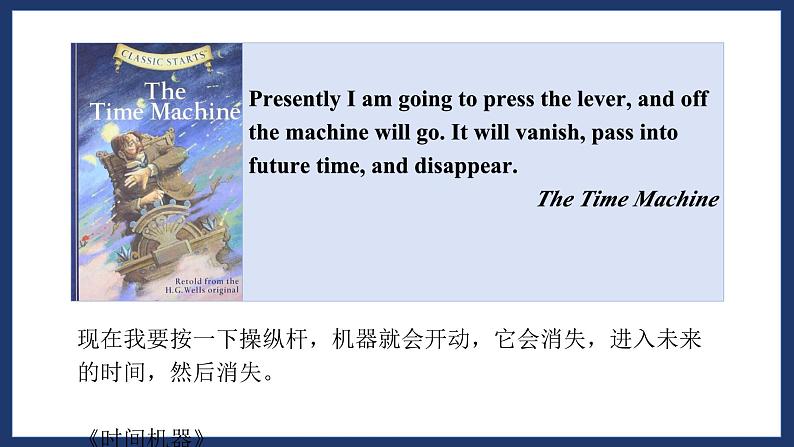 现在我要按一下操纵杆,机器就会开动,它会消失,进入未来的时间,然后消失。 《时间机器》