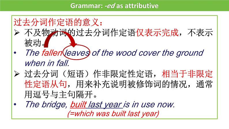 过去分词作定语的意义:不及物动词的过去分词作定语仅表示完成,不表示被动。The fallen leaves f the wd cver the grund when in fall.过去分词(短语)作非限定性定语,相当于非限定性定语从句,用来补充说明被修饰词的情况,通常用逗号与主句隔开。The bridge, built last year is in use nw.