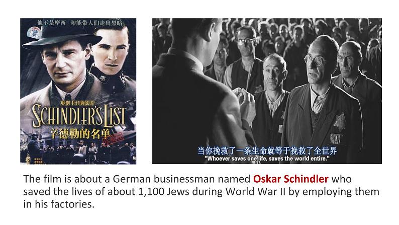 The film is abut a German businessman named Oskar Schindler wh saved the lives f abut 1,100 Jews during Wrld War II by emplying them in his factries.